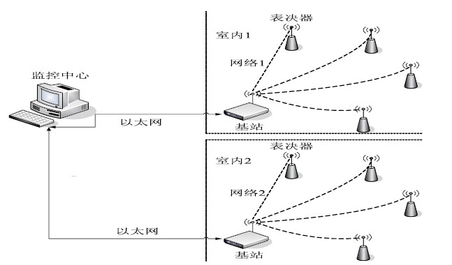 整個(gè)無(wú)線投票表決器系統(tǒng),由監(jiān)控中心,基站,表決器組成,如圖1 所示;炯茸鳛檫h(yuǎn)程監(jiān)控中心與無(wú)線投票表決器設(shè)備通信的樞紐,并且還作為無(wú)線投票表決器網(wǎng)絡(luò)中的協(xié)調(diào)器,維護(hù)和管理整個(gè)無(wú)線網(wǎng)絡(luò);臼占魍镀北頉Q器的投票情況,接受遠(yuǎn)程監(jiān)控中心的指令和定時(shí)訪問(wèn)。
