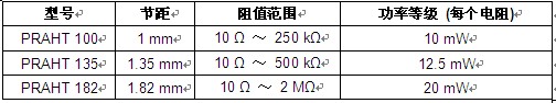 PRAHT系列的節距為1mm、1.35mm或1.82mm,阻值為10Ω~2MΩ,每個電阻的功率等級為10mW~20mW。器件具有小于-35dB的低噪聲,電壓系數小于0.01ppm/V。符合RoHS的電阻網絡提供工作溫度可達+230℃的金端接,或溫度為+200℃的SnAg端接。