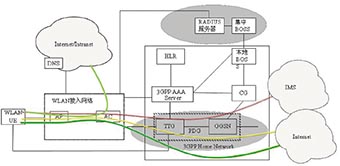 當用戶通過WLAN直接接入IP業務時,用戶可以使用Internet業務。圖中的3GPP AAA Server是為WLAN業務新增的網元,它將配合移動網中的HLR完成用戶的鑒權和接入認證功能。3GPP AAA Server還將配合BOSS系統或者計費網關(CG)完成用戶的計費。這種接入方式能夠保持移動網絡和WLAN的獨立性。對于運營商來說,這種架構非常簡單,易于部署。