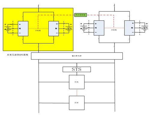 以某品牌為代表的塔式機并聯冗余方式,系統先期采用兩臺30KVA冗余并機系統,后期可以擴容到2N+1的雙母線模式,系統原理如下: