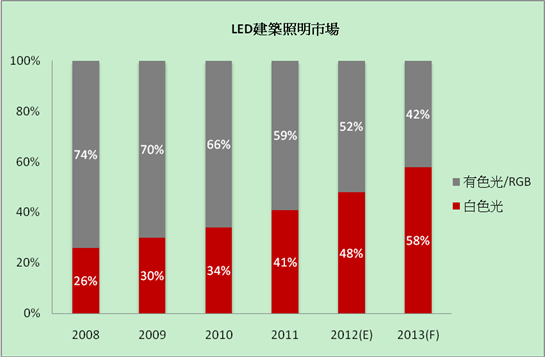 由于LED多種光色特性,讓歐洲各國愿意投資更多經費在促進文化與觀光價值的燈光設計上,以吸引更多觀光客。TrendForce表 示,過去LED的使用多以RGB及Color LED為主要使用顏色,但2011年LED供給遠大過于需求,使得照明用高功率白光LED的ASP每年以35~40%幅度降價,市場上的建筑照明燈具制造 商,已經提高了對白光LED的接受度,因此2011年白光LED在建筑應用上已經超過四成的比例。在白光的發光效率快速改善,以及急速降價下,預計 2013年開始白光將取代RGB/Color成為主要建筑使用顏色。