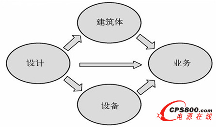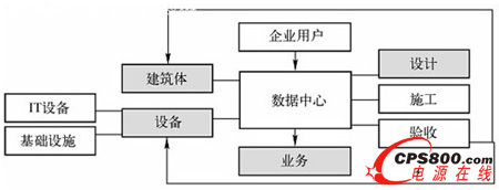 由圖1、圖2可知,數據中心的構建涵蓋了設計、施工、驗收等三個主要階段。在構建完成的數據中心中,建筑體、IT設備、基礎物理設施構成了數據中心的主要載體;在此載體的基礎上運轉相關軟件,支撐企業的主要業務和海量數據。