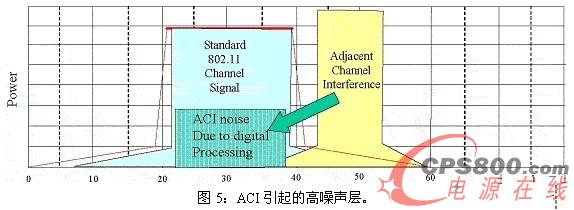 顯然,由商用無線設備生成的信號不盡完美。的確,從802.11射頻發出的信號生成超出其許可頻帶范圍的一些能量,稱之為邊帶發射。這種情況也會出現在其他無線設備上,如藍牙、無繩電話以及其他與802.11占用相同頻帶的設備。雖然通過過濾可以將來自相鄰信道的RF干擾降至最低,但是此干擾還會生成旁瓣能量(sidelobeenergy),此能量屬于802.11WLAN信號的通頻帶范圍內。如果ACI比802.11信號強,來自ACI的邊帶能量將主導信道的噪聲層。如圖2所示。