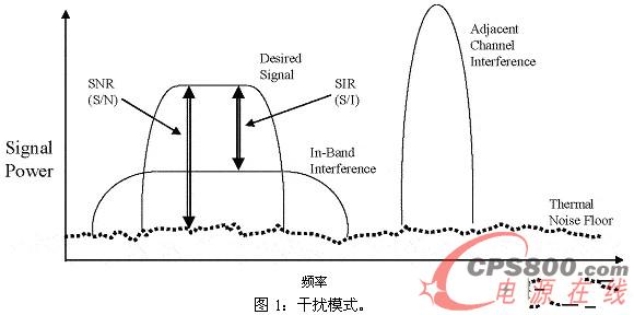 干擾還可能來源于相鄰的信道。在這種情況下,802.11系統的RF子系統與數字過濾的設計還可以對AP或基站的性能造成極大影響。此外,WLAN網絡的物理設計可以消除帶內干擾的很多反射。通常由信號干擾比率(S/I或SIR)決定WLAN的性能,該比率的定義是數據信號與干擾信號的比率。對于WLAN的性能而言,SIR通常比信噪比(SNR)更加重要。下面的圖1解釋了這一概念。