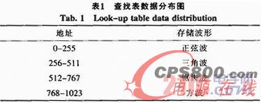 通過對DDS基本原理的分析得知只需更換波形存儲器中的波形采樣數據,就可以得到所需波形的信號。波形數據存儲方式包括順序存儲方式和間隔存儲方式,本設計采用順序存儲方式將方波,三角波,正弦波,鋸齒波4種波形采樣數據全部依次存儲在一個查找表里,數據分布情況如表1所示。通過改變尋址首地址,并在該波形數據存儲地址范圍內循環尋址,從而實現對所需信號波形的輸出。具體實現方法在累加控制模塊中有介紹。