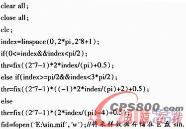 DDS模塊中的波形數據存儲器是用QuartusⅡ中的MegaWizard Plug_In Manager工具添加的LPM_ROM IP核,此存儲器ROM是用波形存儲文件.mif進行初始化,波形數據可以用matlab等工具生成,用matlab生成4種波形的波表數據程序如下: