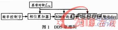 DDS信號發生器是由:頻率控制字、相位累加器、ROM表、D/A轉換器以及模擬低通濾波器LPF組成,原理框圖如圖1所示。