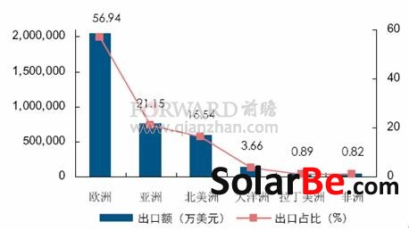 2011年我國光伏產(chǎn)品海外市場及分布(單位:萬美元,%)