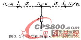 以2臺逆變電源模塊向同一負載供電為例進行簡單的分析,如圖2所示,其中X為線路阻抗,U0為并聯電網電壓。