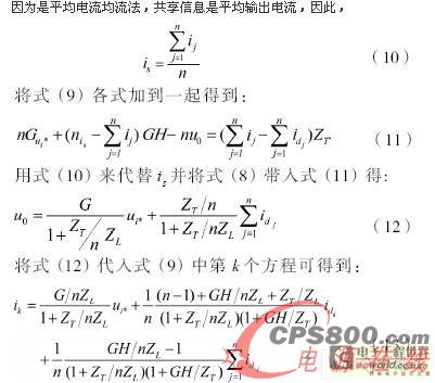 各模塊并聯控制單元檢測相應模塊的市電頻率和相位,給其他各電源模塊發出同步脈沖,無市電時,同步脈沖有晶振產生,各個逆變電源的鎖相環電路用來保證其輸出電壓頻率和相位與同步總線脈沖信號同步。并聯控制單元將其他模塊單元負載電流與本機負載電流作比較,求出電流偏差,并將其作為電壓指令的補償量發送給每個逆變電源單元,以消除各模塊輸出電流的不平衡。控制綜合部分的均流及同步原理如圖1所示。