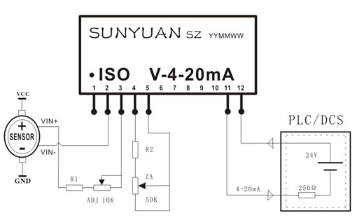 SunYuan SIP12 Pin封裝的二線制電壓信號(hào)隔離配電器:ISO V-4-20mA,是二線制電壓信號(hào)隔離配電模塊,可實(shí)現(xiàn)兩線制電壓輸入配電型傳感器和電橋(稱重)檢測(cè)電路的電壓信號(hào)配送。