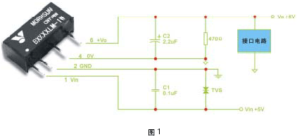 MORNSUN 新出品的B0505LM-1W 系列產品可以更好地應用在此方案中,這款隔離1000VDC 的超小型、高可靠性的DC/DC 轉換器,其輸入電壓為5V,輸出電壓為5V,功率為1W,圖1 為該產品的一種典型應用電路。由于實現輸入與輸出之間1000VDC 的隔離,且輸出短路時間可持續1s,從而能很好的抵御高頻瞬態突波的干擾。