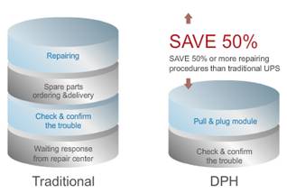 其次,關鍵組件與模塊的熱插入功能可提高UPS系統的可維修性,進而將平均修復時間(MTTR)降低至接近零的程度,以確保最長的運作時間及數據中心的最高可用度。使用標準作業程序(SOP),可快速更換模塊,相較于傳統的單機式UPS,可節省至少50%以上的維修時間。