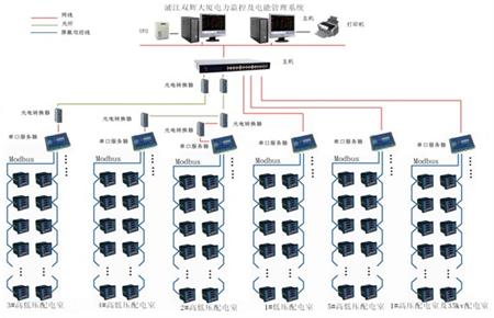 各智能電力儀表通過屏蔽雙絞線RS485接口,采用MODBUS通訊協議總線型連接接入通訊服務器。然后35kv配電室、1#配電室高低壓部分和5#配電室高低壓部分通過網線直接與值班室的工業交換機相連, 3#高低壓部分通過光纜直接與值班室的工業交換機相連,4#高低壓部分通過光纜先連到2#配電室,再和2#高低壓部分一起通過光纜一起連到值班室的工業交換機。最后工業交換機通過網線連到值班室的兩臺主機。