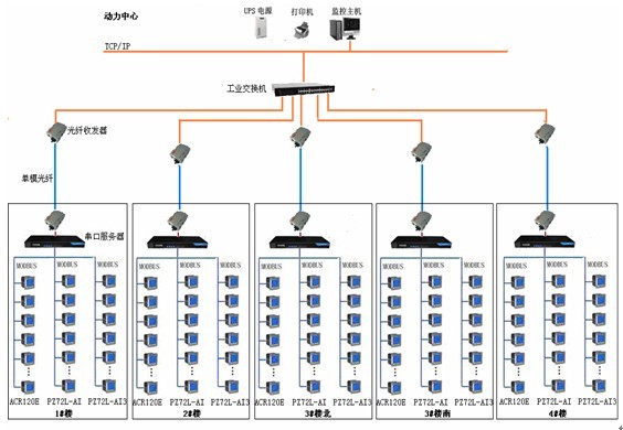 整個系統(tǒng)采用網絡分布式結構,監(jiān)控主機位于2#樓前面地下一層的動力中心中,其他5個配電室分別位于1#、2#、3#、4#地下一層(其中3#有南北兩個配電室)。該項目實現(xiàn)了淄博運動員公寓4個樓內電力系統(tǒng)的智能管理。設計方案為4個樓內的5個配電室,通過光電轉換器經過光纖拉倒2#樓前面地下一層的動力中心。5個配電室現(xiàn)場放置通訊機柜,儀表數(shù)據(jù)通過485接口,MODBUS通訊協(xié)議經光電轉換器輸送到動力中心。