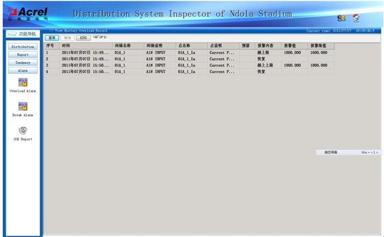 電力監(jiān)控系統(tǒng)為整個(gè)體育場低壓配電系統(tǒng)運(yùn)行狀態(tài)的監(jiān)測提供了一套完整的解決方案,通過計(jì)算機(jī)界面反映給值班員和系統(tǒng)管理人員。系統(tǒng)軟件采用全英文界面,通過界面左側(cè)的樹形按鍵菜單進(jìn)行畫面切換操作。其中報(bào)警功能只對中國留守人員開放,故該功能界面設(shè)定成中文。本系統(tǒng)的具體功能如下: