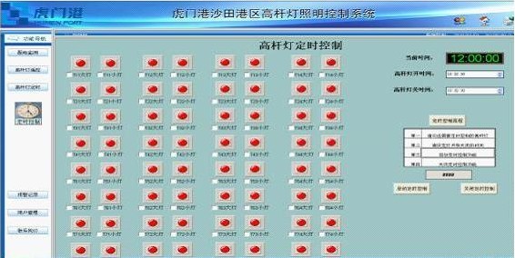 本系統實現對虎門港碼頭32桿高桿燈(64只燈泡)進行遠程定時及手動控制,在正常情況下,系統將會按照管理員所設定時間對高桿燈自動進行點亮及熄滅操作,提高了碼頭照明的及時性、同步性、合理性;同時系統還具有遠程手動控制,避免了因天氣多變帶來的碼頭照明問題,提高了操作的靈活性,大大降低了電能的浪費,保證了資源的合理利用。圖3為高桿燈控制畫面。