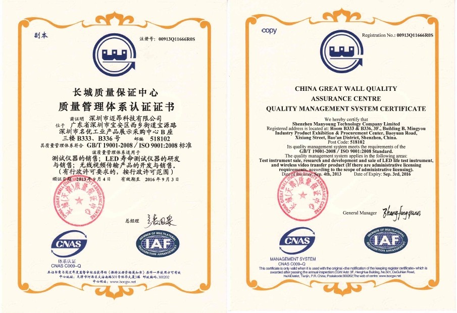 經(jīng)過公司全體同事的通力合作,邁昂科技已經(jīng)順利通過權威ISO認證機構的嚴格審核,于2013年9月4日正式獲得ISO9001:2008質(zhì)量管理體系認證證書。
