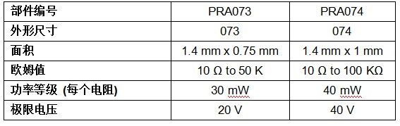 新的PRA陣列每個電阻之間的間距為0.7mm,面積非常小,PRA073為1.4mm x 0.75mm,PRA074(兩個電阻)為1.4mm x 1mm。這些器件的歐姆值最高為100KΩ,在+70℃下每個電阻的功率等級可達40mW,極限電壓為40V。PRA073和PRA074均具有10ppm/℃的嚴格TCR,噪聲低于-35dB,電壓系數小于0.01ppm/V。