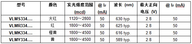 VLM.334…系列器件使用最先進的AllnGaP技術,亮度非常高,典型發光強度達到3760mcd,在70mA下的最大發光強度達到6052mcd,熱性能優于前一代LED。VLM.334… LED的PN結到周邊環境的熱阻為300K/W,比此前的VLM.333產品低25%。