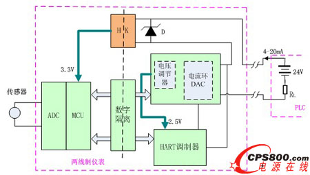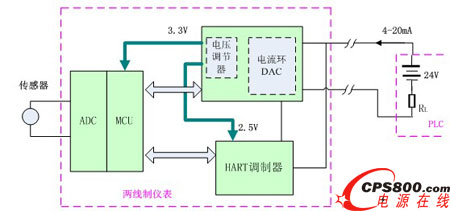 圖一的電路中,傳感器的信號經(jīng)過ADC轉換成數(shù)字信號,再經(jīng)MCU發(fā)送給電流環(huán)DAC及HART調(diào)制器,形成4-20mA的信號輸出,電流環(huán)DAC從PLC輸出的4-20mA總線上取電,經(jīng)內(nèi)置的電壓調(diào)節(jié)器輸出3.3V及2.5V,給MCU及HART調(diào)制器提供少量的電源。