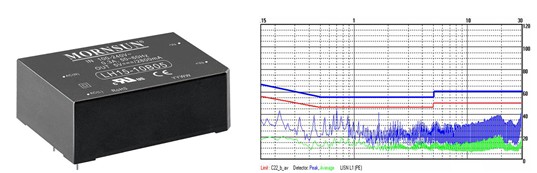 上圖為MORNSUN電源LH15-10B05的電源應用到某品牌產品上面后,整機測試傳導騷擾結果,此結果無法符合EN55022/CISPR22的CLASS B要求,甚至連CLASS A都無法滿足要求,更不用說設計余量。