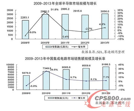 在全球經濟緩慢復蘇的影響下,中國電子產品出口規模再創新高,智能移動終端設備成為中國集成電路市場新的應用熱點。2013年中國集成電路市場銷售額增至9166.3億元,增速為7.1%。