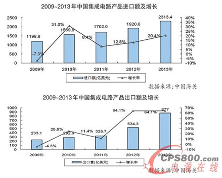 2013年全年,我國集成電路進出口總值達到3190.4億美元,同比增長29%,保持快速增長勢頭。其中,出口額為877.0億美元,同比增長64.1%;進口額為2313.4億美元,同比增長20.4%,進出口額均保持高速增長。但同時,中國集成電路進出口貿易逆差為1436.4億美元,較上年同期的1391億美元擴大近50億美元,連續第4年擴大,進出口結構亟待優化。