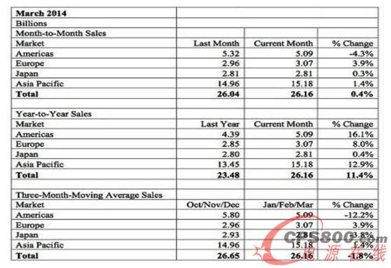 美國(guó)半導(dǎo)體產(chǎn)業(yè)協(xié)會(huì)(SIA)引述國(guó)際半導(dǎo)體貿(mào)易統(tǒng)計(jì)組織(WSTS)的最新數(shù)據(jù)指出, 2014年3月全球芯片銷售額的三個(gè)月平均值為261.6億美元,較2013年同月增長(zhǎng)11.4%。