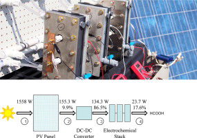 據(jù)報(bào)道,由美國(guó)電力天然氣公共服務(wù)公司慷慨提供的在整個(gè)州電力高壓線桿頂上的商業(yè)太陽(yáng)能電池板,其產(chǎn)生的能量可將二氧化碳和水轉(zhuǎn)換成甲酸。這一過(guò)程發(fā)生在一個(gè)電化學(xué)的電池里,包含長(zhǎng)方形午餐盒大小的金屬板封裝可以輸送液體的通道。