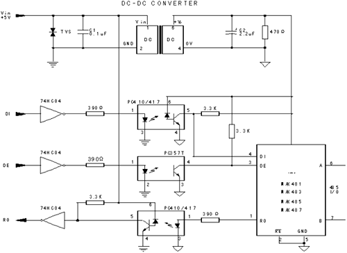 一、DC/DC電源模塊在RS485接口電路的應用(DC/DC電源模塊:隔離1000VDC, In:5V, Out:5V, P:1W),其電路如下圖: