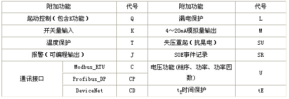 智能型電動機保護器具有熱繼電器所不具備的控制功能、測量功能(三相電流、電壓、功率、功率因數、電能、頻率、熱容量、電流不平衡率、漏電流值等)、故障記錄功能(當前運行時間、當前停車時間、累計運行時間、啟動電流、啟動時間、操作次數、輸入輸出狀態、8次故障記錄、運行狀態指示)、4-20mA輸出功能、通訊功能、狀態量檢測功能。
