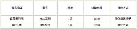 一般情況下,根據輸入信號、外形、內孔尺寸來選擇霍爾電流傳感器。在傳感器行業內,江蘇安科瑞嚴格按照JB/T 7490-2007《霍爾電流互感器》行業標準規定的各項要求,相對于同行采用插針式接線不同,一律采用綠色可插拔端子,現場接線方便、可靠。常見的品牌產品如下表: