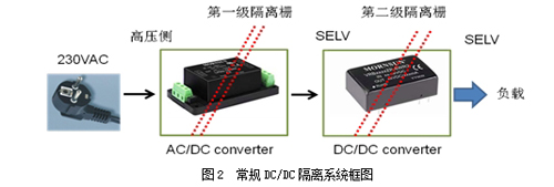 傳統的DC-DC一般作為電源系統的二次電源,前級都會有一級AC-DC作為一次電源,而DC-DC更多的作為二級隔離作用,具有隔離降低共模噪聲、電壓轉換等作用,此時的一次側交流電壓的干擾經過了AC-DC的隔離,再經過DC-DC二次隔離,對于控制系統來說,電壓是非常穩定了,因此不存在如上的問題。其系統架構如圖2所示,DC/DC的輸入和輸出都處于SELV低壓安全電路中。
