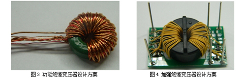 我們知道圖2中的AC-DC本身采用的是一種加強絕緣設計,因此,我們必須考慮在圖2的DC-DC部分采用類似的設計來增強絕緣性能。首先變壓器的絕緣線不能選擇普通的漆包線,而是三層絕緣線。其次,輸入和輸出的電氣間隙將必須設計得更長,需要參考EN60950的標準和實際的工作電壓來選取。例如工作電壓為480V AC,則電氣間隙則需要大于等于6.4mm。另外一方面,變壓器和PCB的設計工藝也大不相同。