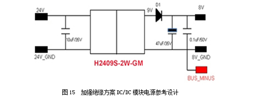 如圖1所示采樣IC在采集母線電壓時,處于高電壓側的采樣系統與處于低壓安全電壓側的控制系統之間存在極大的共模電勢差,加上IGBT系統工作時引入的開關尖峰,這個電勢差高達幾kV。因此信號的隔離我們采用滿足UL的37.5kV AC隔離耐壓等級的光耦來實現,同時我們需要為之配套一款滿足UL隔離耐壓不低于2.5kV AC的DC/DC電源模塊。值得注意的是,高電壓側是位于DC/DC的輸出端,這種應用具有一些特別的隱性技術需求,會給設計帶來難題。