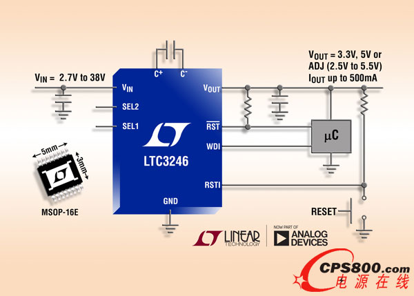 亞德諾半導體(AnalogDevices,Inc.,簡稱ADI)旗下凌力爾特公司(LinearTechnologyCorporation)推出緊湊型、低噪聲降壓-升壓型充電泵LTC3246,該器件具集成的看門狗定時器,能提供高達500mA的輸出電流。LTC3246采用多模式開關電容器轉換,以在2.7V至38V輸入電壓范圍內保持穩定,并產生穩定的3.3V、5V或外部可調的(2.5V至5V)輸出。內部電路自動地選擇2:1、1:1或1:2的轉換比,以在輸入電壓和負載條件變化時優化效率。低的工作電流(無負載時20μA調節,停機時1.5μA)、低EMI切換和很少的外部器件(3個小型陶瓷電容器,無電感器)使LTC3246非常適合噪聲敏感型空間受限的汽車應用,例如ECU/CAN收發器電源,以及工業內務處理電源和高效率、低功率12V至5V轉換。