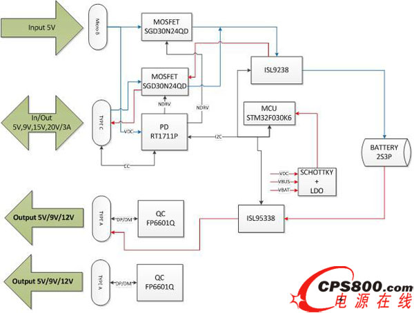 在該系統中應用的立锜(Richtek)的RT1711P為TYPE-C PD的控制IC,為標準TCPC控制接口,并包含了VBUS的OVP、OCP等保護功能。在目前該方案中,主要應用于移動電源TYPE-C接口DRP PD雙向電源協議物理層的溝通。并可以透過一個外部按鍵進行電源供電方向的改變。