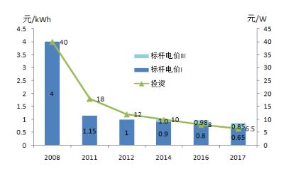 光伏發電投資、發電成本和電價也實現了大幅度下降,初始投資從2010年的約20元/瓦,降到2015年的8-9元/瓦,再到2017年的6-7元/瓦,光伏發電標桿電價從2011年的1.15元/千瓦時,降到2014年的0.9-1.0元/千瓦時,再到2017年0.65-0.85元/千瓦時。2016年光伏領跑技術基地最低中標電價達到0.45元/千瓦時,中標電價水平普遍低于當年光伏標桿電價15-35%。