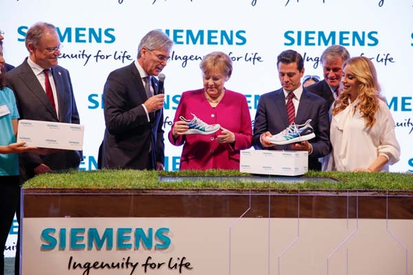 西門子股份公司總裁兼首席執(zhí)行官凱颯(Joe Kaeser)向德國總理默克爾和墨西哥總統(tǒng)培尼亞贈送運用西門子技術制造的運動鞋