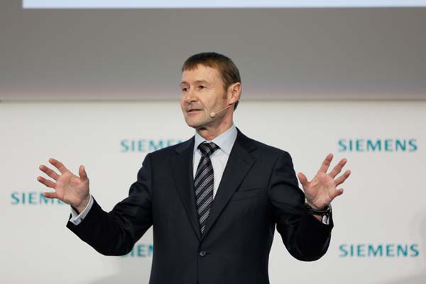 西門子股份公司管理委員會成員何睿祺(Klaus Helmrich)在4月23日的漢諾威工業(yè)博覽會新聞發(fā)布會上講話