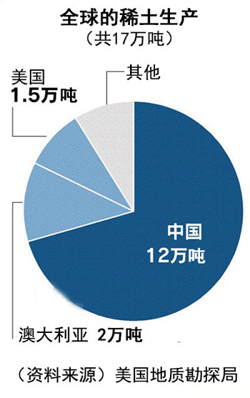 稀土生產集中于中國。美國地質勘探局(USGS)統計顯示,中國產量達到12萬噸,大幅超過居第2位的澳大利亞(2萬噸)和第3位的美國(1.5萬噸),占到世界整體(17萬噸)的7成。