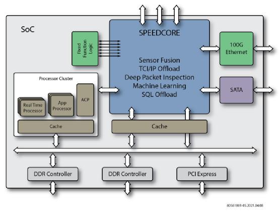 Achronix是唯一一家能夠同時提供獨立FPGA芯片和嵌入式FPGA(eFPGA)半導體知識產權(IP)技術的公司,因此在支持成本降低計劃方面具有獨特的優勢,其中可編程邏輯和互連功能可以集成到一個SoC中,如下圖所示。Speedcore eFPGA IP使用與Speedster7t FPGA相同的技術,支持從Speedster7t FPGA到集成Speedcore模塊的ASIC的無縫轉換。當使用Speedcore IP將Speedster7t FPGA轉換為ASIC時,客戶有望降低高達50%的功耗和節省高達90%的單位成本。