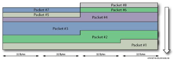二維片上網絡提供的一項重要功能是分組模式(Packet Mode),該模式旨在更容易地將到達高帶寬端口(如以太網)的數據重新排列為多個數據流。分組模式可以分離到達速率為200Gb/s或400Gb/s以太網端口的數據包,并將它們傳輸到不同的軟核。這種數據包分離如下圖所示,連續的數據包被分布到FPGA的不同部分。因此,分組模式可以輕松創建負載平衡架構,而使用傳統FPGA是難以實現這樣的功能。