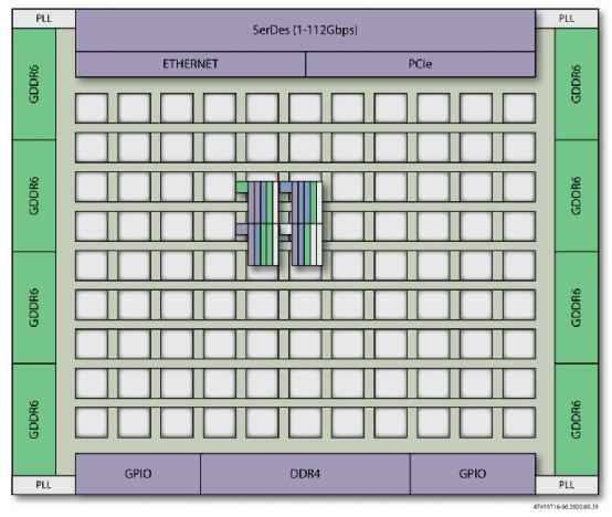 Achronix Speedster7t系列FPGA器件克服了傳統FPGA所面臨的問題,其中部分原因是它采用了一種專用的二維片上網絡(2D NoC),通過在網絡的不同部分進行多個并行操作,這種互連可以實現高達20Tb/s的總帶寬。相對于FPGA架構互連,二維片上網絡不僅在速度上有了巨大的提升,而且能夠在多個PCIe Gen5、400Gbps以太網端口和GDDR6存儲器接口之間以更高的速率傳輸大量的數據,而不會消耗任何FPGA的可編程資源。