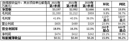 “第三季度毛利率為41.6%,比預期中位數高60個基點。第三季度營業利潤率從去年同期12.3%提高到18.9%,凈利潤幾乎翻了一番,達到4.74億美元。