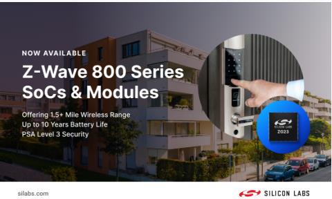中國,北京–2021年12月15日–致力于以安全、智能無線技術建立更互聯世界的全球領導者Silicon Labs(亦稱“芯科科技”,NASDAQ:SLAB)今日宣布:推出Z-Wave 800系列芯片(SoC)和模塊,可用于采用Z-Wave協議的智能家居和自動化應用。新的EFR32ZG23(ZG23)SoC和ZGM230S模塊使用了Silicon Labs屢獲殊榮的第二代無線SoC平臺,為開發人員提供了可用于網狀網的Z-Wave Mesh模式和更遠通訊距離的Z-Wave Long Range模式,頻點都在1GHz以下(sub-GHz)的無線通訊,是智能家居、多住戶單元樓(MDU)、酒店和照明應用的理想選擇,SoC和模塊都可以用來做終端設備和網關。Z-Wave 800系列是業界最安全的、具有超低功耗的無線連接解決方案,適用于先進的、高性能的、電池供電的物聯網(IoT)設備;與Z-Wave 700系列相比,電池使用壽命提高了50%以上。