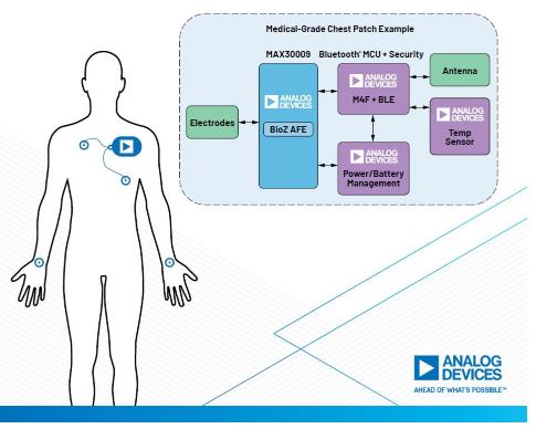 中國,北京–2022年3月9日–Analog Devices,Inc.(ADI)日前推出低功耗、高性能生物阻抗(BioZ)模擬前端(AFE)MAX30009,旨在幫助縮小BioZ遠程患者監測(RPM)設備的尺寸并延長設備的使用壽命。這款片上AFE為開發小尺寸、電池供電的可穿戴連續監測設備而設計,在監測健康狀況的可穿戴設備和醫用級貼片等應用中提供生物阻抗分析的臨床級生命體征測量,以評估患者的健康狀況。