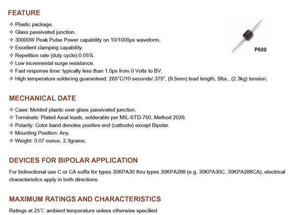 30KPA SERIES大功率瞬態(tài)抑制二級(jí)管產(chǎn)品詳情