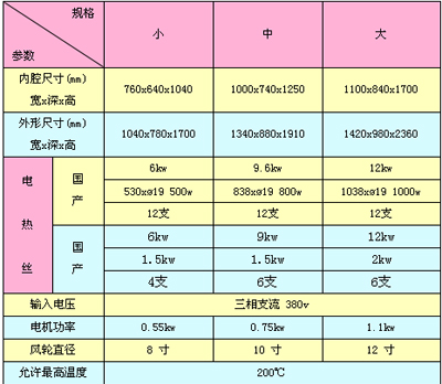 除表中所列三種規格外,可根據客戶的要求設計、制造其他不同規格的烘爐。